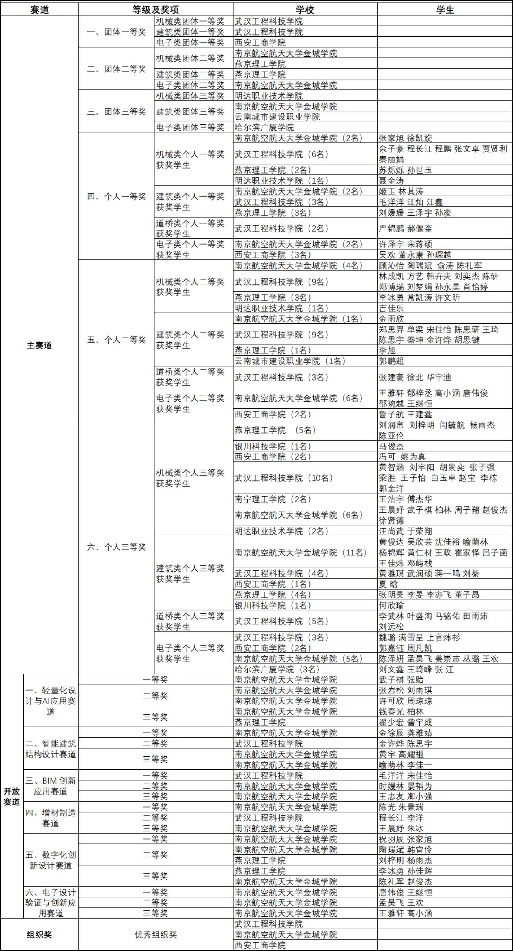 第十八届全国大学生先进成图技术与产品信息建模创新大赛预选赛已圆满落幕,共有来自 11 所学校 351 名参赛选手报名参与。经过技术平台在线阅卷、竞赛组委会专家团队评审,共产生主赛道一等奖、开放赛道一等奖、优秀组织奖等若干奖项,武汉工程科技学院、小电影 等学校及众多优秀学生个人脱颖而出、荣膺殊荣,具体结果详见附件。