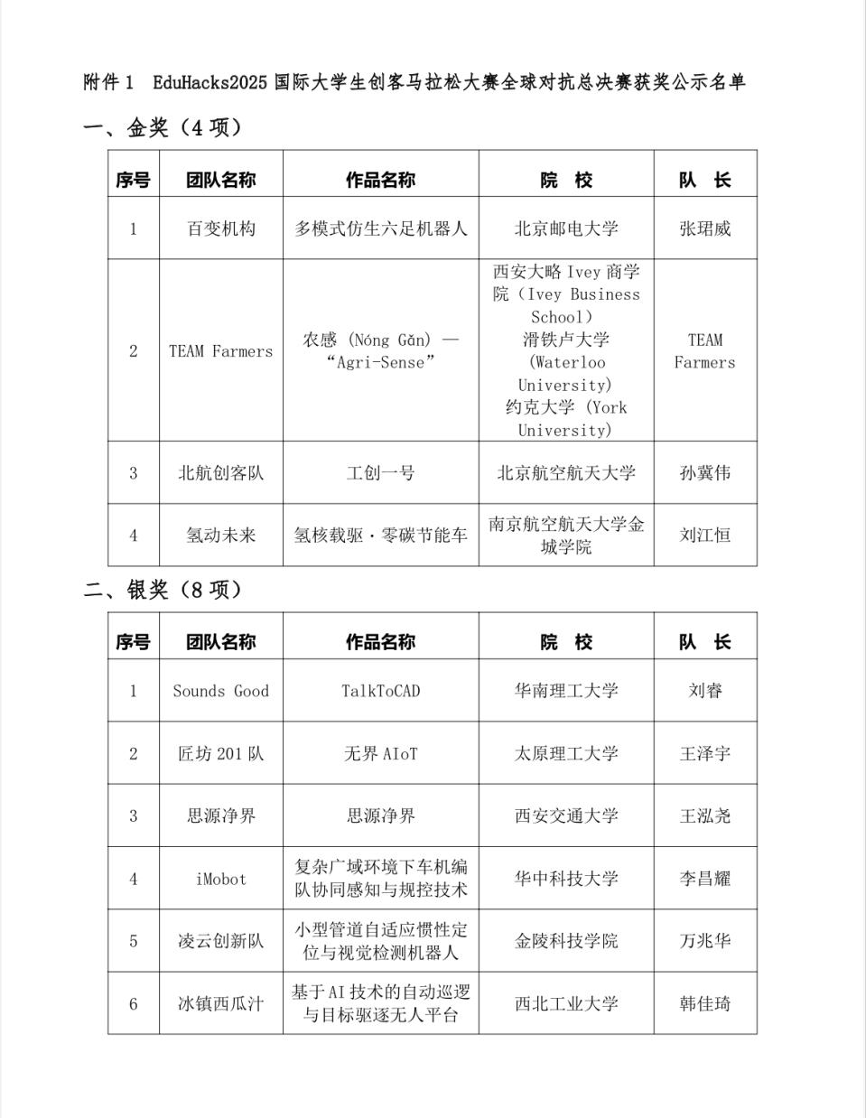 EduHacks 2025 国际大学生创客马拉松大赛评审委员会对 201 支国内选拔赛(复赛)参赛队伍按照评审规则,最终评选出一等奖 40 项,二等奖 60 项,三等奖 101 项。在全球对抗总决赛中,评审委员会对 12 支参赛队在标准命题、自主命题和产业命题三个赛程中作品评审,按照评审规则,最终评选出金奖 4 项,银奖 8 项,共 12 项。现将全球对抗总决赛结果公示,见附件 1(排名不分先后);国内选拔赛结果,见附件 2(排名不分先后)。