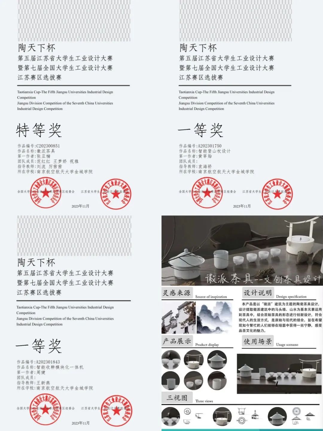 21200542班张亚楠和范红红、王梦娇、祝雅共同完成的《徽派茶具》荣获大赛特等奖,20200542班黄莘贻同学的《智能登山杖设计》荣获大赛一等奖,20210541班周健同学的《职能收割模块化一体机》荣获大赛一等奖。其他同学的优秀作品荣获二等奖和三等奖。
