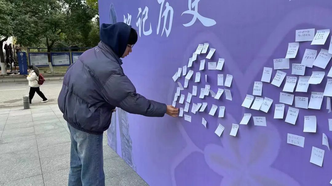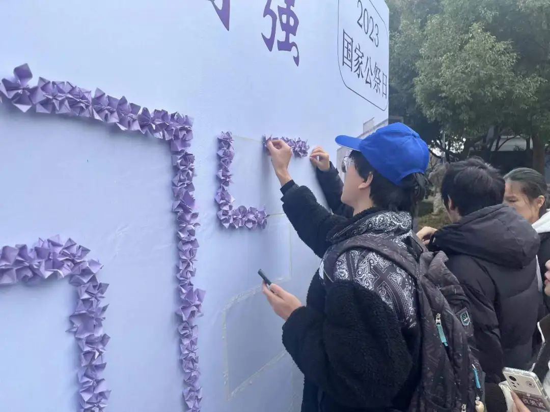 12月13日,国际商学院举行了“铭记历史,勿忘国耻”国家公祭日主题活动。同学们通过在大喷上张贴卡片留言,折纸花来缅怀遇难同胞。同时,志愿者给同学们发放紫金草微章、贴纸,宣传讲解紫金草的意义:一朵紫金草,守望和平路。