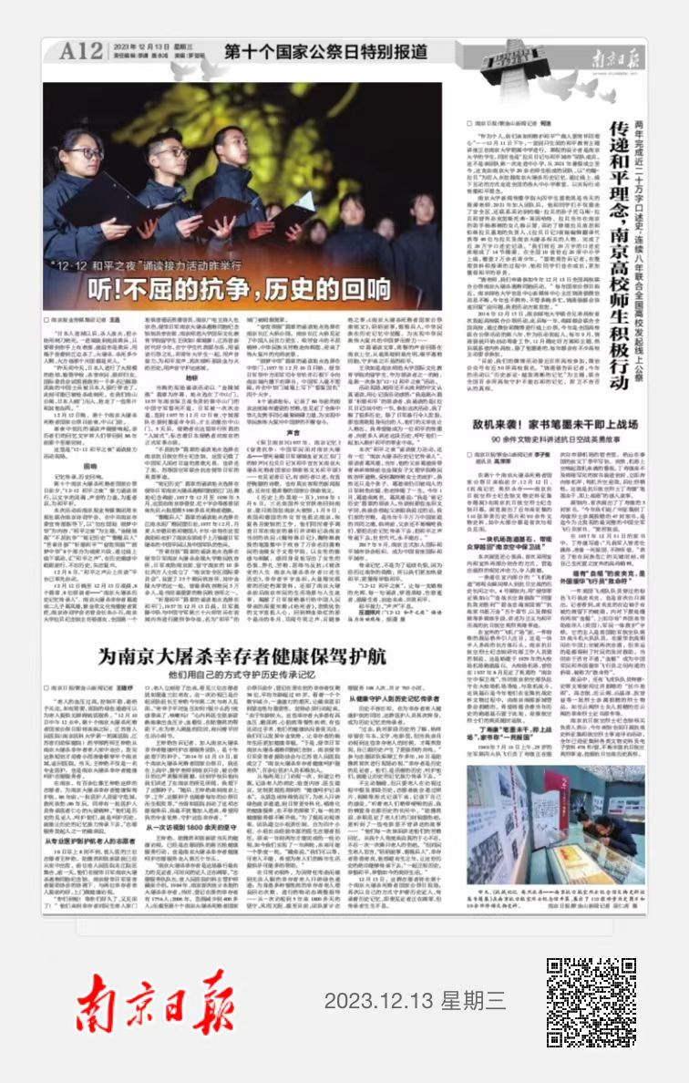 第十个国家公祭日前夕,“12·12 和平之夜”接力诵读举行,以文字的灵魂、声音的力量,为逝者哀,为和平祈,机自院红宣会的同学作为此次接力诵读活动的诵读人员参加了本次活动。本次活动由南京报业传媒集团周末报社联合南京诗词学会,在中共南京市委宣传部指导下,以“勿忘国耻 圆梦中华”为内容,“和平之夜”为主题,“金陵城殇”“不屈抗争”“铭记历史”“警醒后人”“吾辈自强”“祈愿和平”“奋发图强”“圆梦中华”8个部分为线索片段,通过线上线下联动,汇“和平之声”,在历史痛感中砥砺前行,不忘历史,矢志复兴。