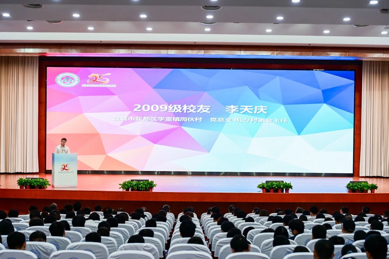 “母校犹如一盏明灯,为我们系好‘人生第一粒扣子’,为我们树立正确的世界观、人生观、价值观奠定了坚实基础,让我们得以健康成长,终生受益,从而能够更好地报效国家、奉献社会。”2009级优秀校友代表,现任盐城市盐都区学富镇周伙村党总支书记、村委会主任李天庆感慨道。2013年他大学毕业后,毅然选择扎根基层,回到家乡工作,他带领着村两委班子,积极探寻乡村振兴的新路径,先后获得江苏省“千名领先”村书记、江苏省最美基层高校毕业生、盐城市优秀共产党员、盐城市乡村振兴先进个人、盐城市五四青年奖章、江苏省乡村振兴青年先锋等荣誉。